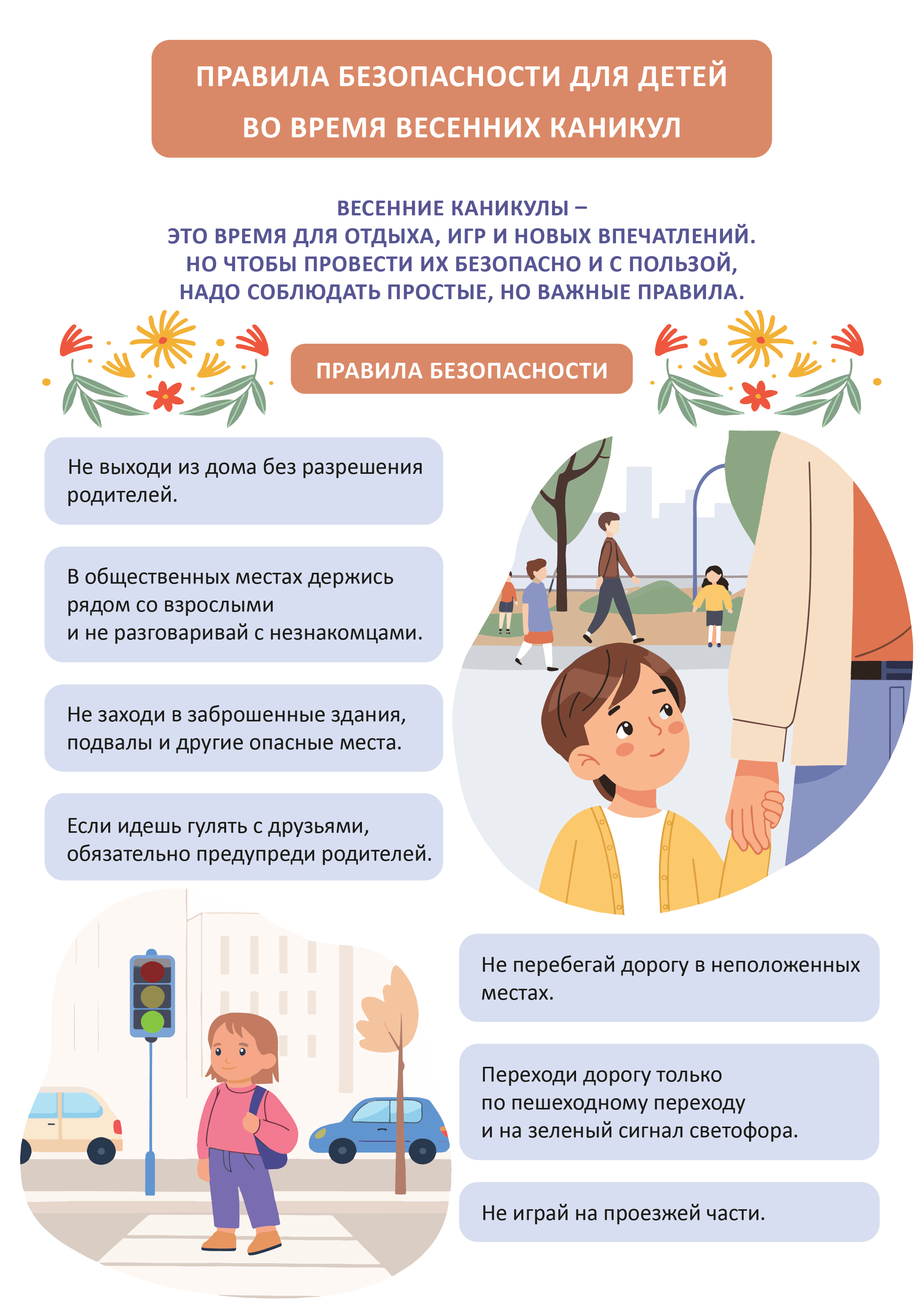 Весенние каникулы будут длиться 8 дней, пройдут с 22 марта по 29 марта 2026 года включительно. В эти дни у вашего ребенка появится много свободного времени. Напоминаем вам о правилах безопасности и возможных мерах по предупреждению травматизма:
